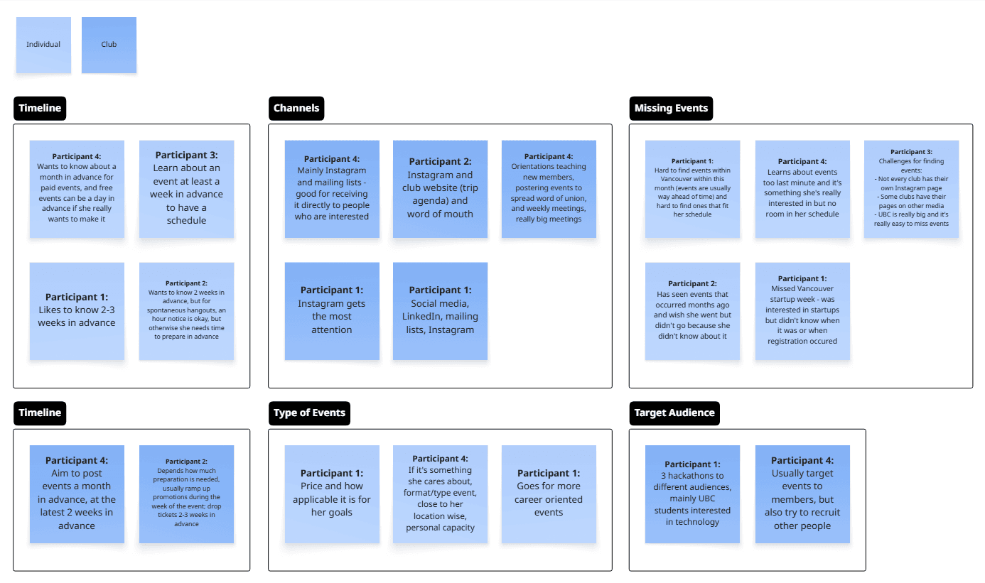 The cluster labelled “Missing Events” in the affinity diagram reveals that users frequently miss events because they learned of the event or registration time too late. The questionnaire suggested some difficulty using all the platforms and tools, indicating that there is currently no single platform students prefer, thus needing to check multiple platforms to find an event.