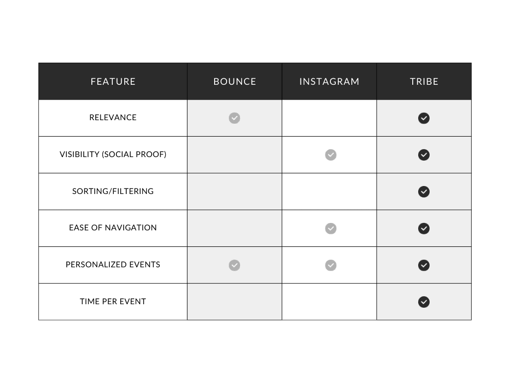 Although the app was already about 70% completed when I was brought on, I started with a competitor analysis of the two main apps that I knew people were currently using to find events to determine the direction that I needed to head in in completing the app.
